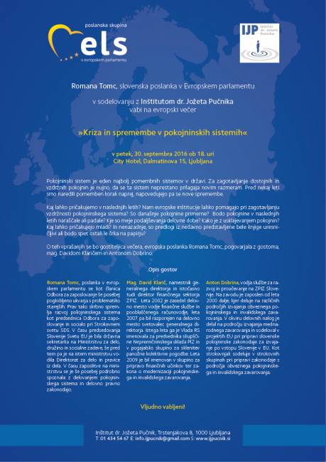 Vljudno vas vabimo evropski večer "Kriza in spremembe v pokojninskih sistemih", ki ga v petek, 30. septembra 2016 ob 18. uri v City Hotelu, Dalmatinova 15, Ljubljana, organizira evropska poslanka Romana Tomc v sodelovanju z Inštitutom dr. Jožeta Pučnika.